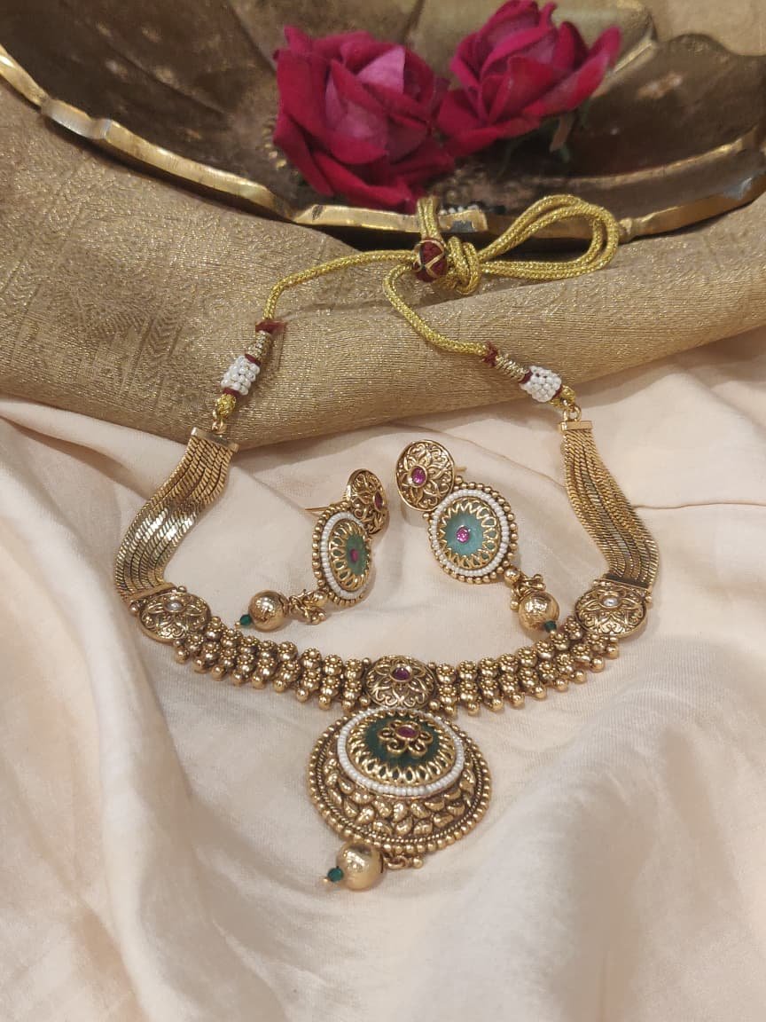 Add timeless elegance to your jewellery collection with this beautifully crafted antique finish Kundan necklace set. Designed with intricate traditional motifs, the necklace features rich gold-toned detailing accented with green and pink stones, delicate kundan work, and classic pearl highlights. The layered bead design and ornate central pendant lend a regal charm to the set.