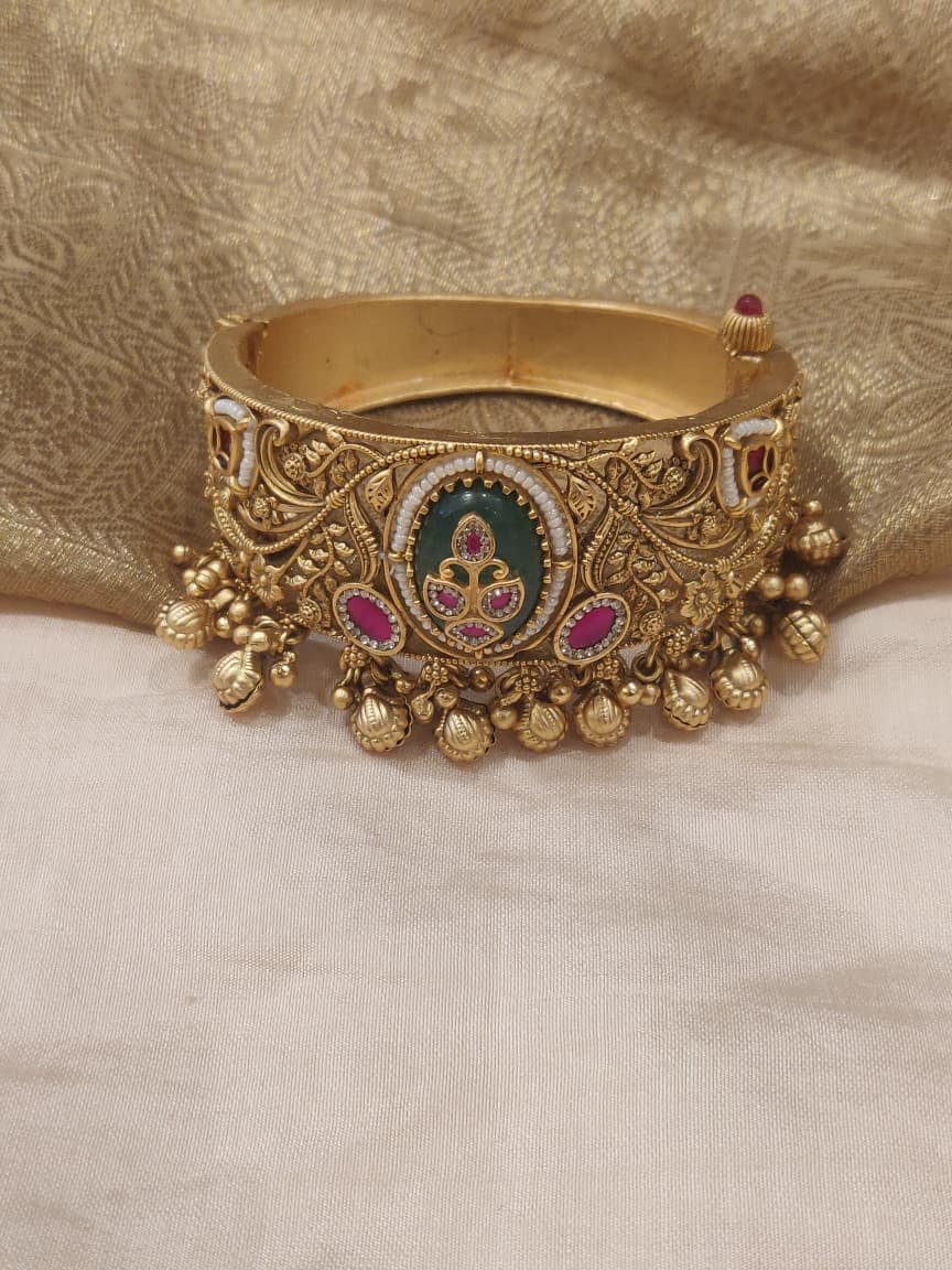 Add royal elegance to your jewellery collection with this exquisitely handcrafted antique-finish gold bangle. Designed with intricate floral carvings and traditional Kundan Polki detailing, the bangle features a striking emerald-green centerpiece framed by ruby-toned stones and delicate pearl accents. The dangling gold bead charms enhance its graceful movement, making it perfect for bridal wear, festive occasions, and cultural celebrations.