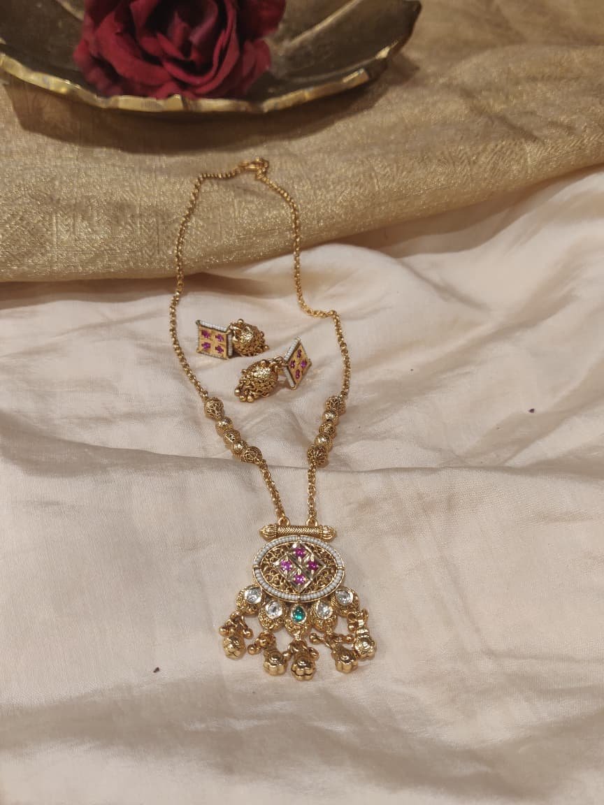 Step into elegance with the Blush Majesty Necklace & Earrings Set. This ornate ensemble features a traditional gold-toned necklace with a central pendant showcasing a radiant pink gemstone, beautifully framed by smaller white and blue stones. Dangling floral motifs embedded with sparkling stones add movement and charm to the design. The matching earrings mirror the necklace’s artistry with pink and white stones, creating a cohesive and luxurious look. Perfect for weddings, festive occasions, or cultural celebrations, this set blends timeless craftsmanship with modern sophistication. Lightweight yet striking, it ensures comfort while elevating your ensemble with vibrant brilliance.