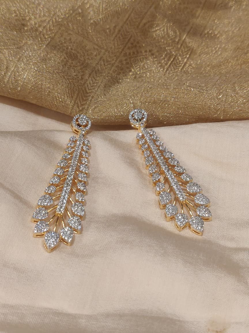 Product Description Elevate your look with these gorgeous Feather Drop Earrings, a stunning blend of modern design and classic sparkle. Crafted with a delicate, elongated silhouette, these earrings are completely encrusted with brilliant American Diamonds (AD) that catch the light from every angle. The design mimics the graceful structure of a feather or leaf, creating a striking visual impact that is lightweight and comfortable enough for all-day wear.