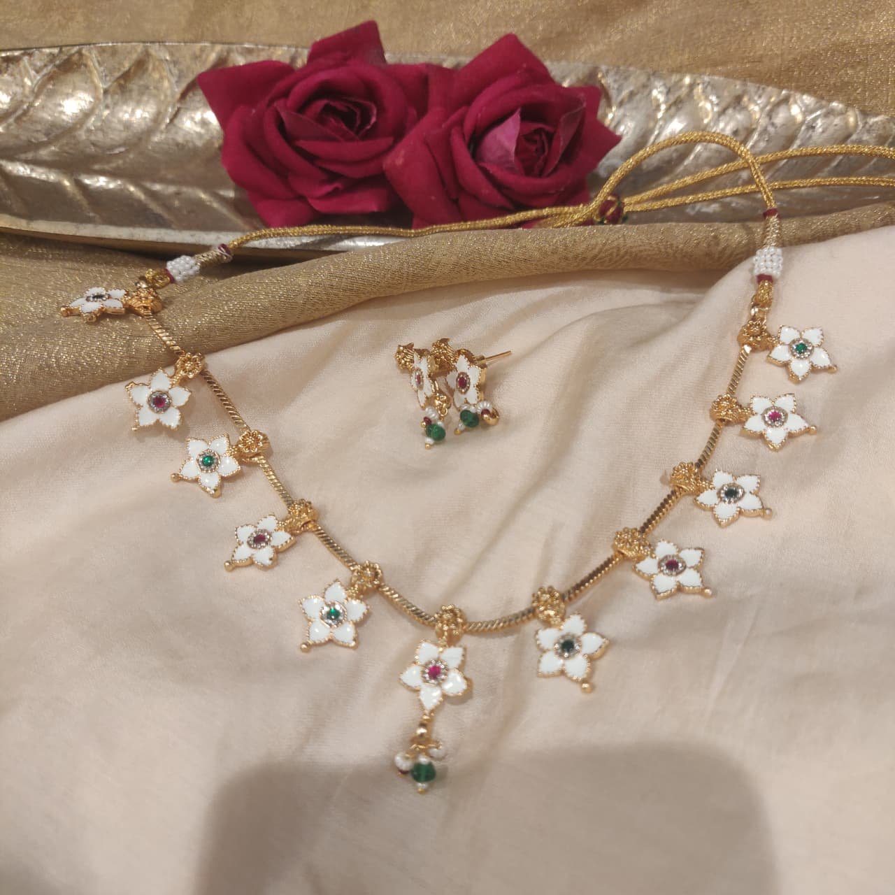 Add a touch of elegance to your ethnic look with this charming gold finish floral necklace set. Designed with delicate white enamel flower motifs and accented with red and green stone centers, this lightweight necklace is finished with dainty bead drops for graceful movement. The set comes with perfectly matching floral stud earrings, making it ideal for festive occasions, weddings, and traditional gatherings.