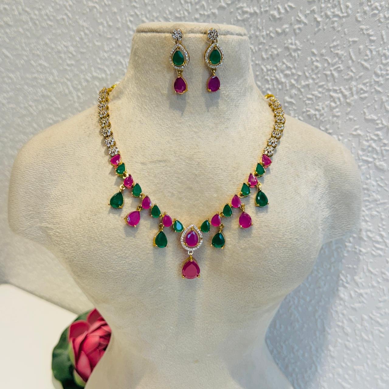Add a vibrant splash of royal elegance to your jewelry collection with this stunning emerald green and ruby pink necklace set. Crafted in a luxurious gold-tone finish and adorned with sparkling stones, this set is designed to make you stand out at every celebration.