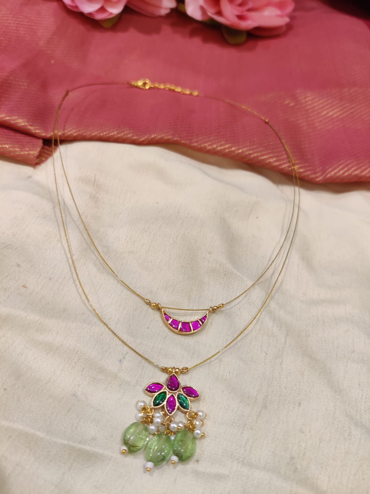 Fashionable 2 Layer Slim Chain With Floral Pendent With Light Green Beads