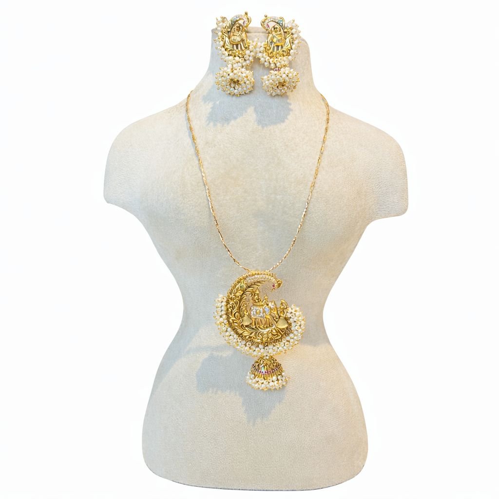 Add a touch of charm to your festive collection with the Moon Grace Pendant Necklace Set. Designed with a crescent-inspired pendant and delicate pearl detailing, this set comes with matching earrings for an elegant traditional finish.