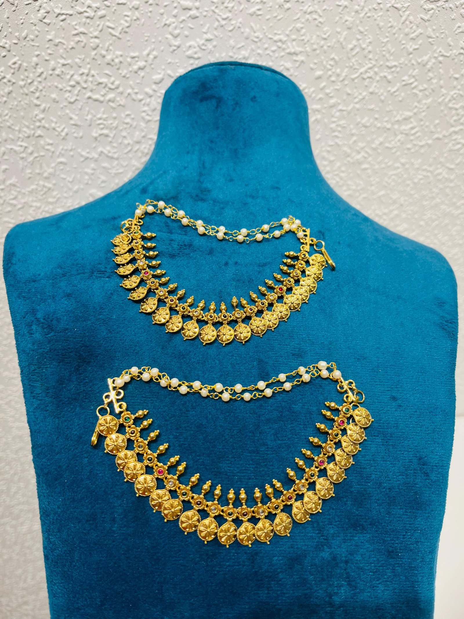 Be the first to review “Inimitable golden plate with multi colour small stone 2 layer necklace” Cancel reply