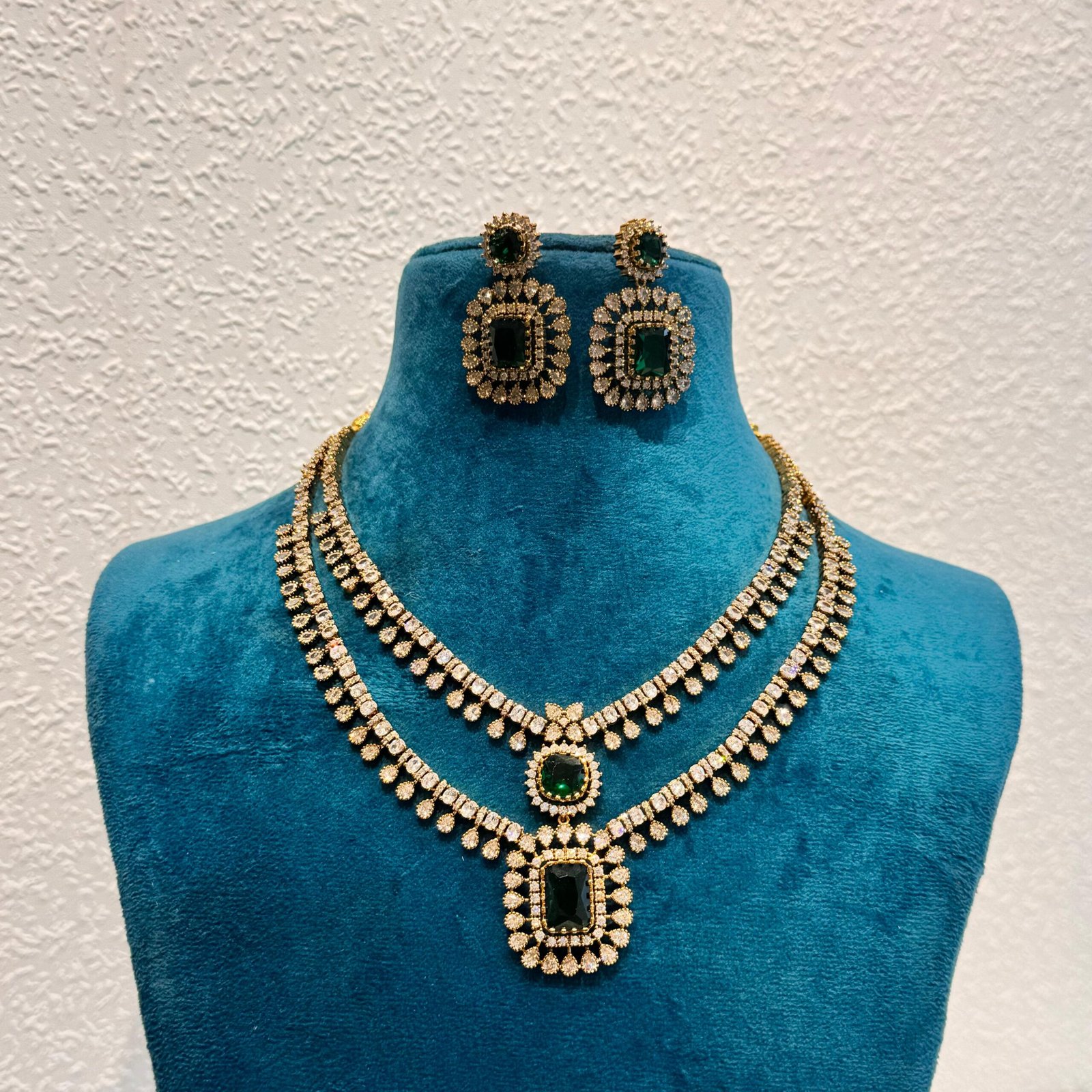 Ornate Mesmerizing Captivating 2 layer ad diamond and emerald stone necklace