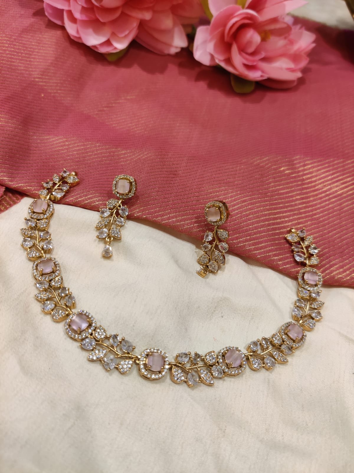 Be the first to review “Radiant Crystal Leafs Neckalce With Pink Ad stone” Cancel reply