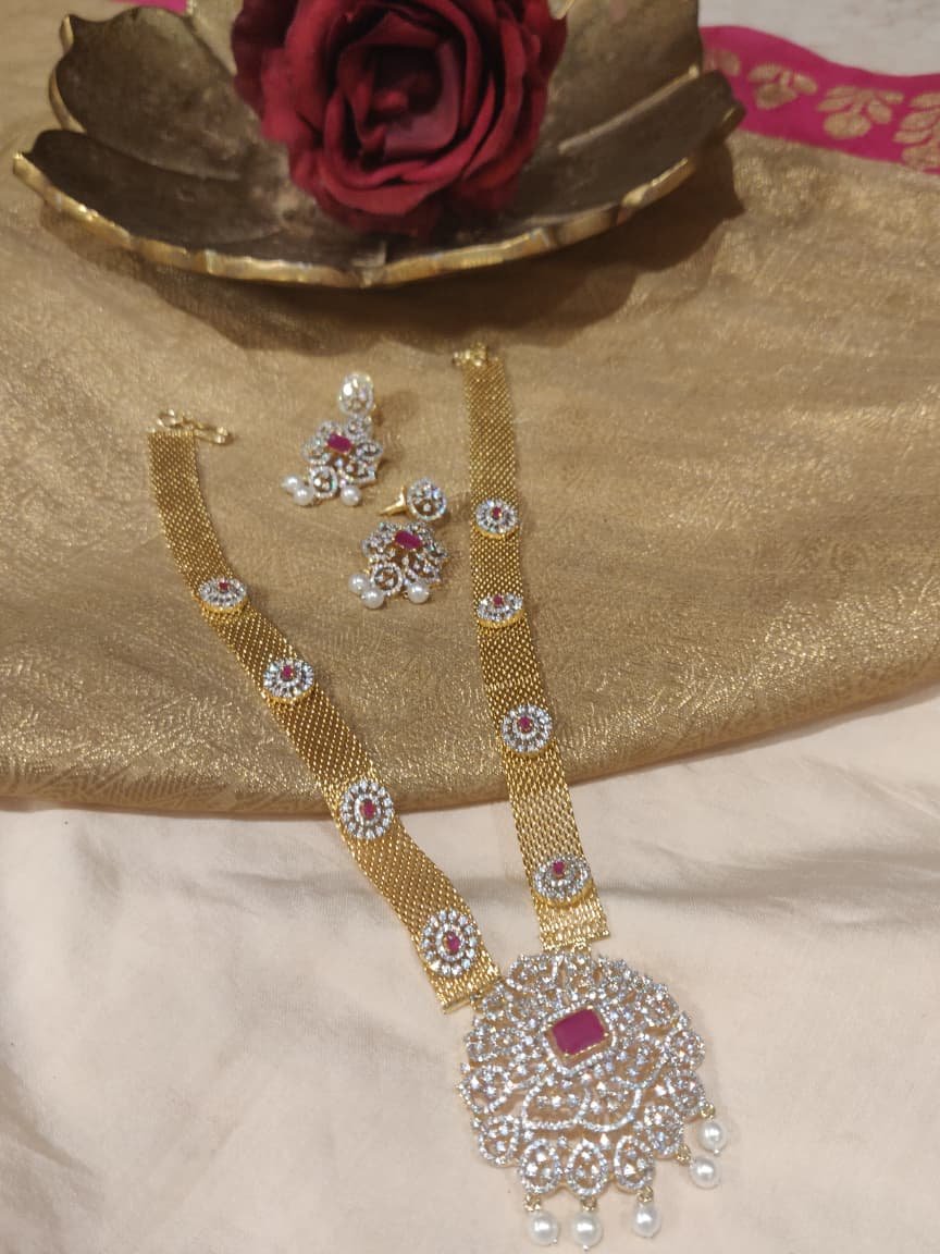 Sophisticated Fashionable Posh pink rose stone with ad stone and pearls with golden chain necklace