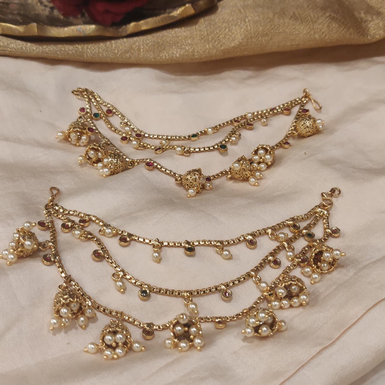 - Adorned with pearls, red and green stones, and filigree detailing
