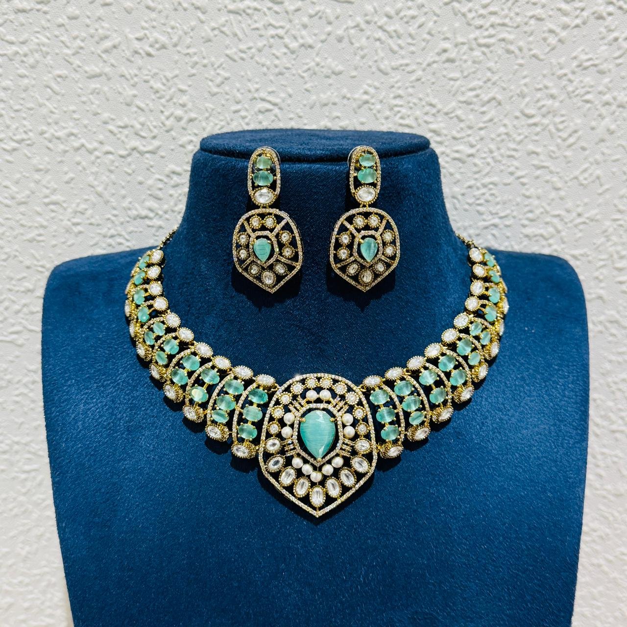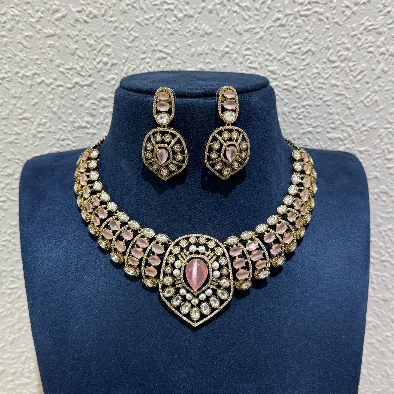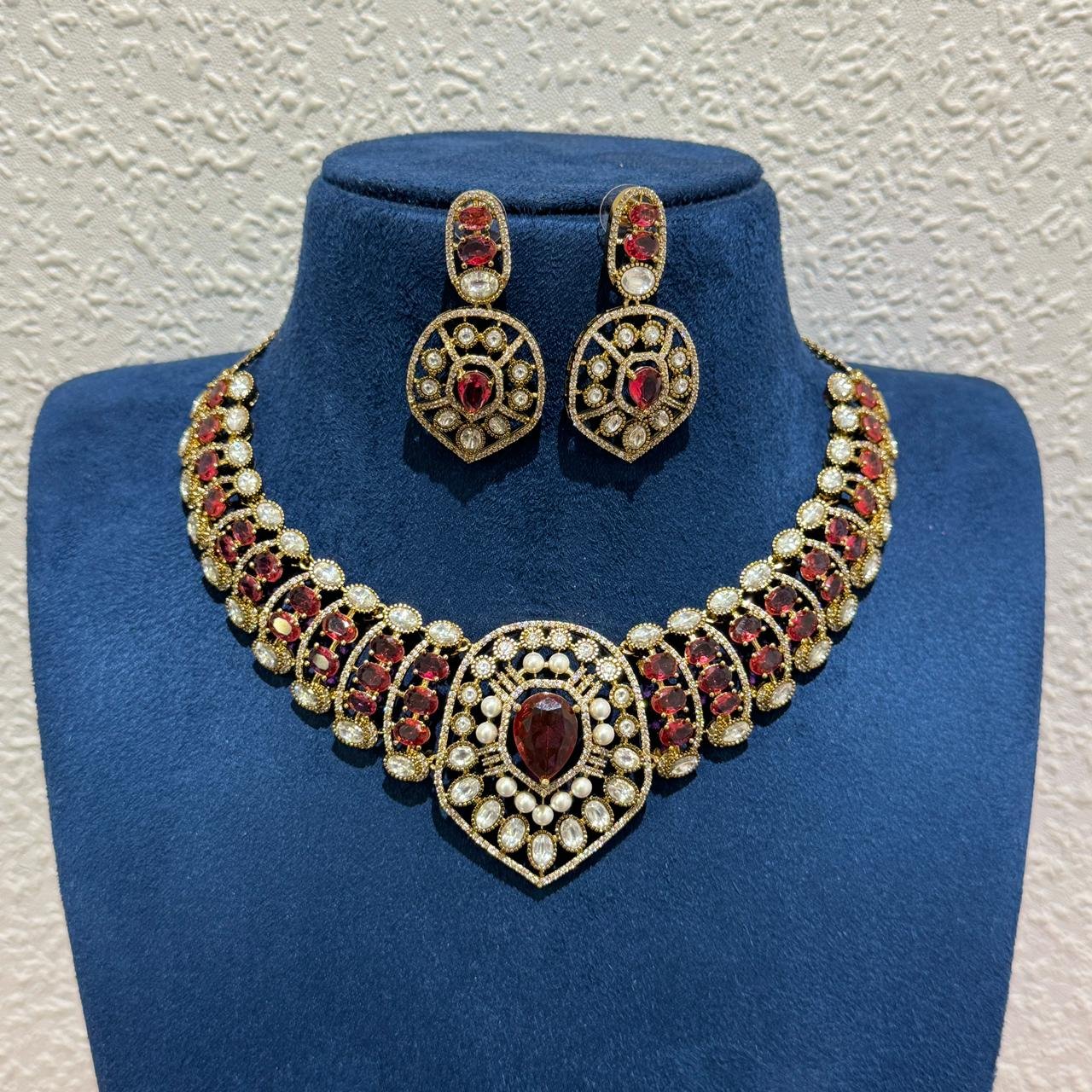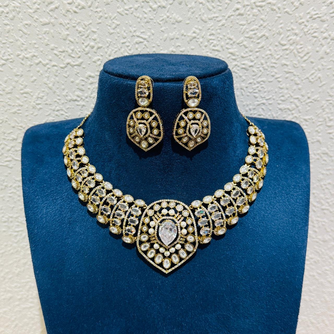 The necklace is beautifully paired with matching statement earrings that echo the same ornate craftsmanship, making this set ideal for weddings, festive occasions, and special celebrations. Available in multiple stone color options, this versatile piece effortlessly complements both traditional and contemporary ensembles.