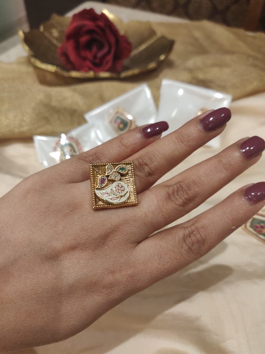 Elevate your style with the Royal Bloom Square Statement Ring. This ornate piece showcases a bold square-shaped design, intricately detailed with embedded stones in vibrant green, pink, and white hues. The decorative motif, inspired by floral and paisley artistry, reflects traditional craftsmanship while offering a modern statement look. Perfect for weddings, festive occasions, or cultural celebrations, this ring blends timeless elegance with striking detail. Comfortable yet eye-catching, it ensures your ensemble shines with regal sophistication.