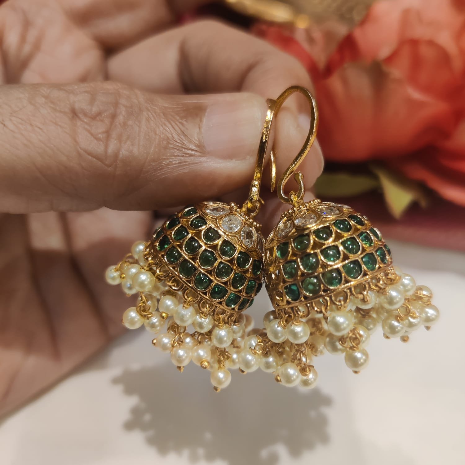 Be the first to review “Scintillating Green AD Stone Jhumka With White Beads” Cancel reply