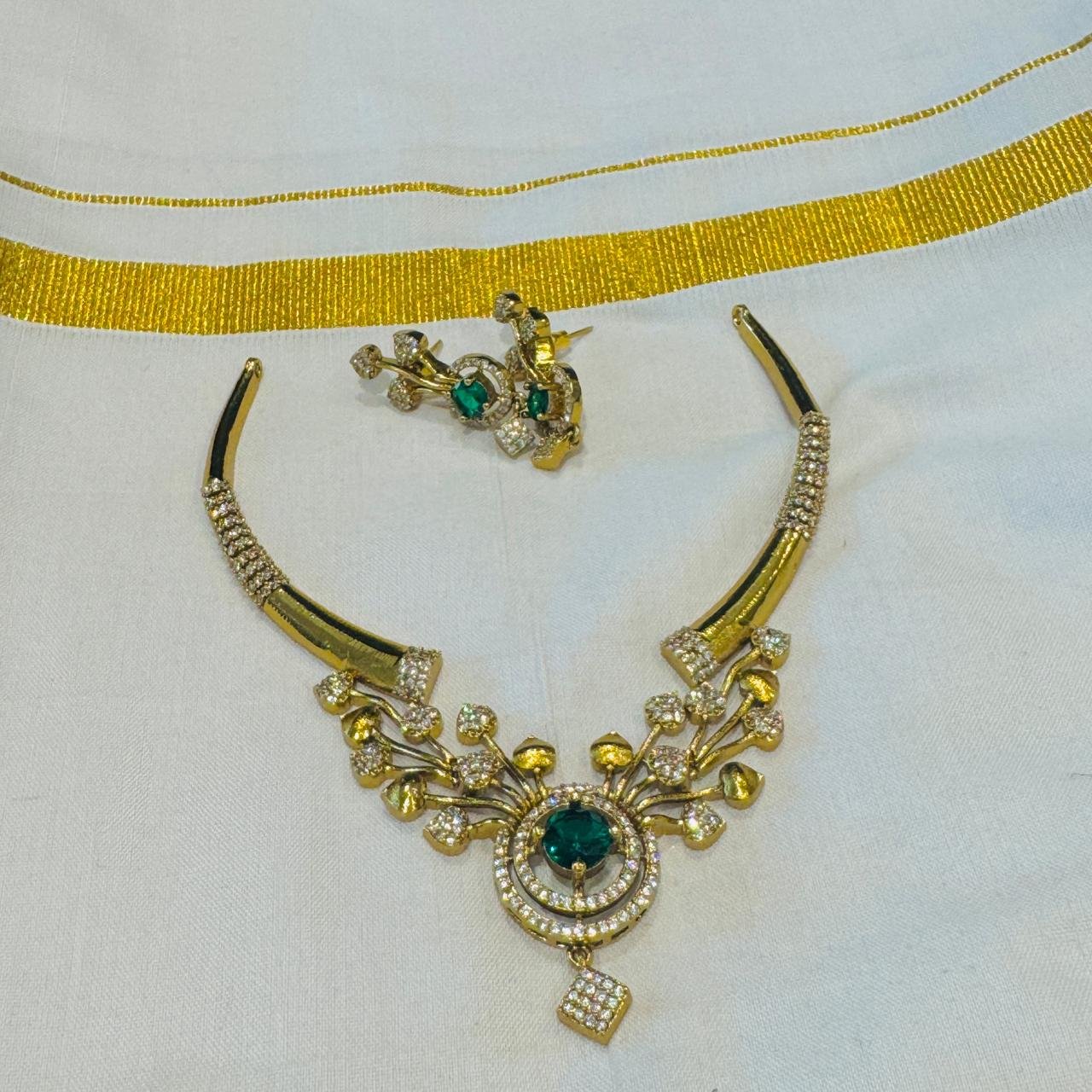 Elevate your festive and party looks with this elegant gold-finish necklace set, featuring a striking emerald green center stone framed by sparkling white crystals. The modern floral-inspired design paired with matching stud earrings creates a perfect balance of sophistication and glamour, making it ideal for weddings, receptions, and special occasions.