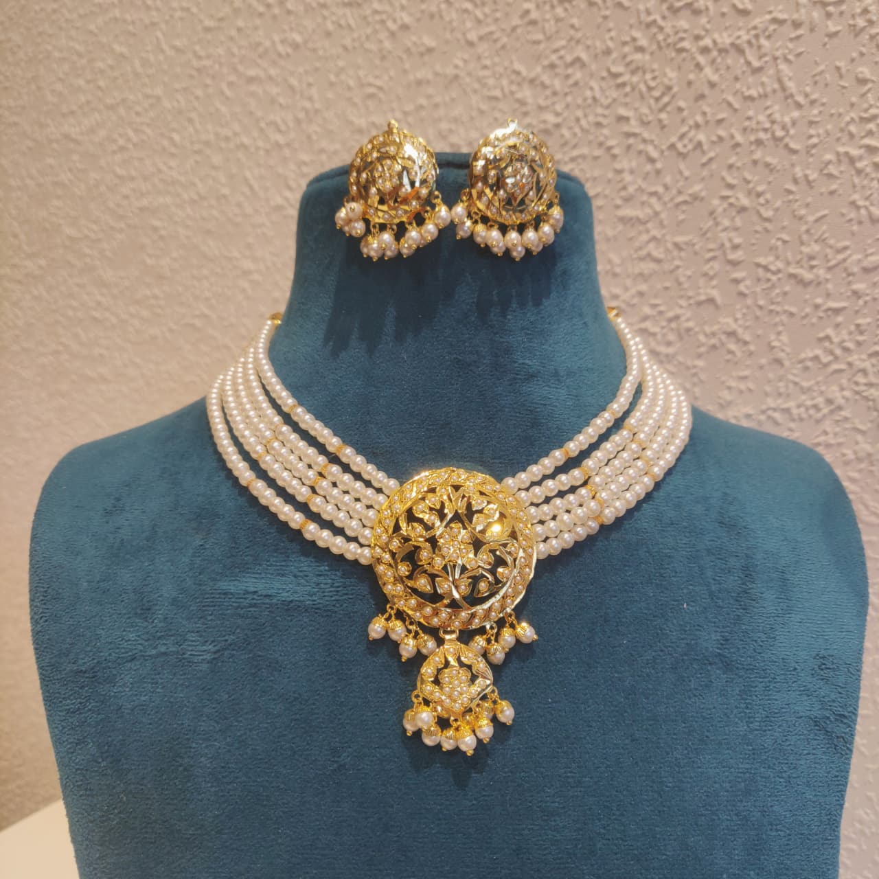 Sought Leayer Pearl Choker With Golden Floral Pendant