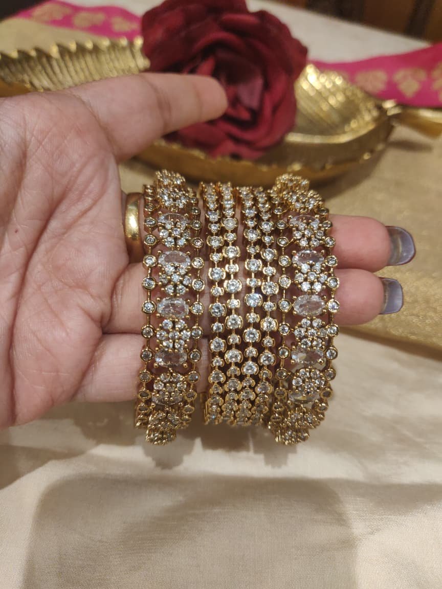 Stunning Floral Kadas: The set features two broad statement bangles, each showcasing intricate flower-shaped clusters and oval-cut center stones for a majestic, multi-dimensional sparkle.