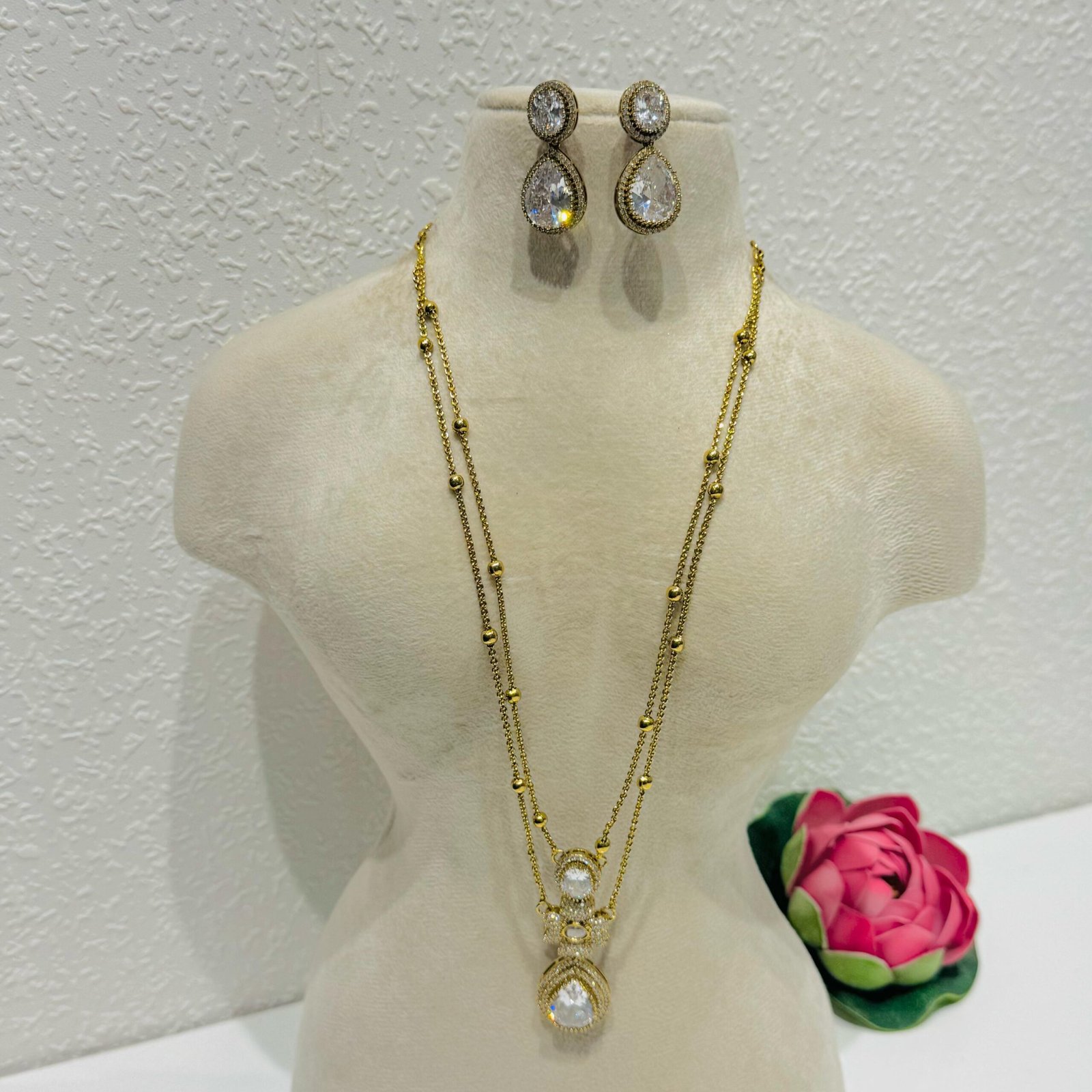 Timeless floral design crystal stone 2 layer golden chain necklace