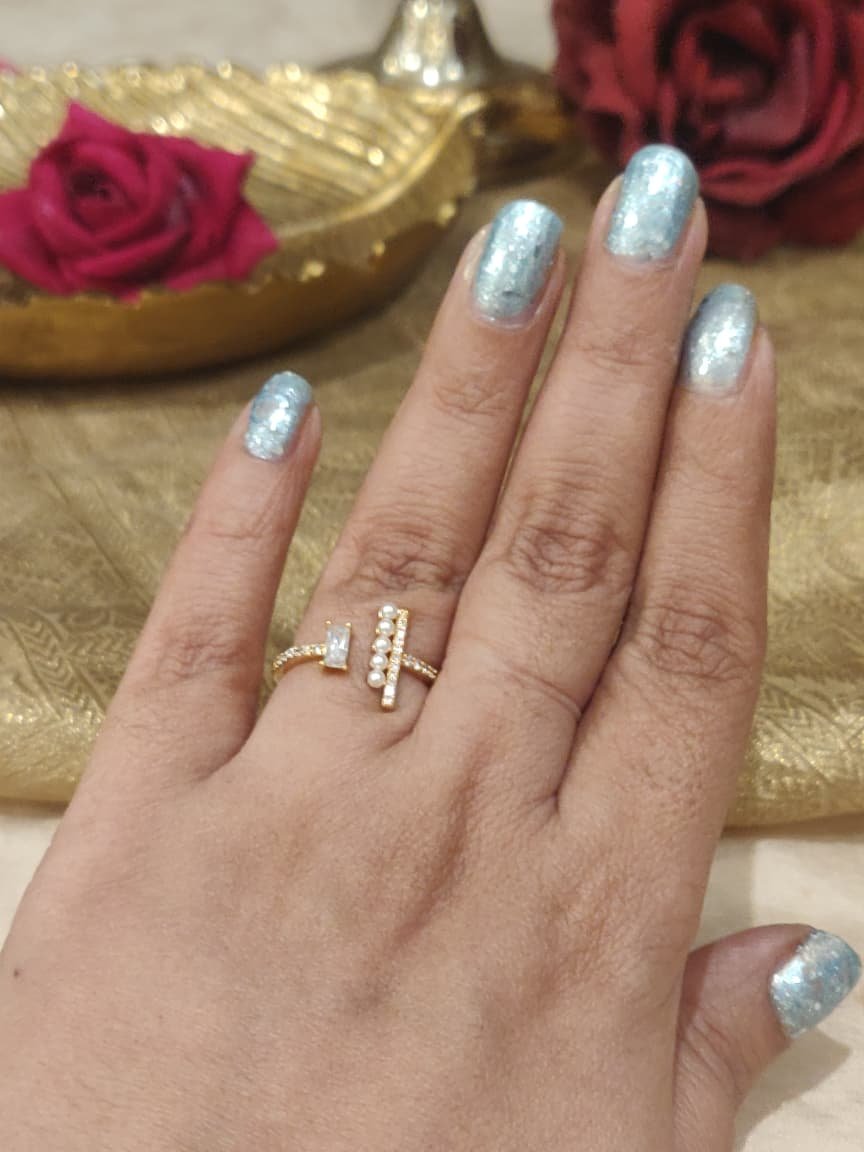 Crafted with a slender, stone-encrusted band, this adjustable ring offers a comfortable and personalized fit for any finger. Whether worn as a chic everyday accessory or as a delicate statement piece for evening events, its versatile design effortlessly bridges the gap between contemporary fashion and classic elegance.