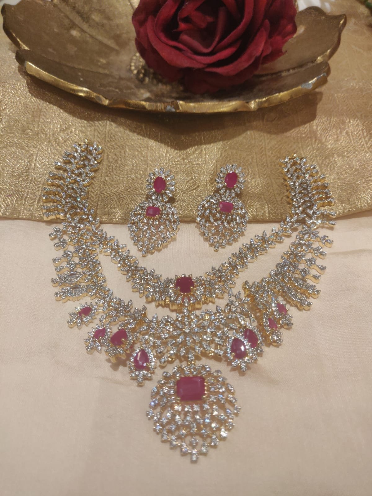 Unique 2 Layer CZ Leafs 2 Layer Red Ad Stone Necklace